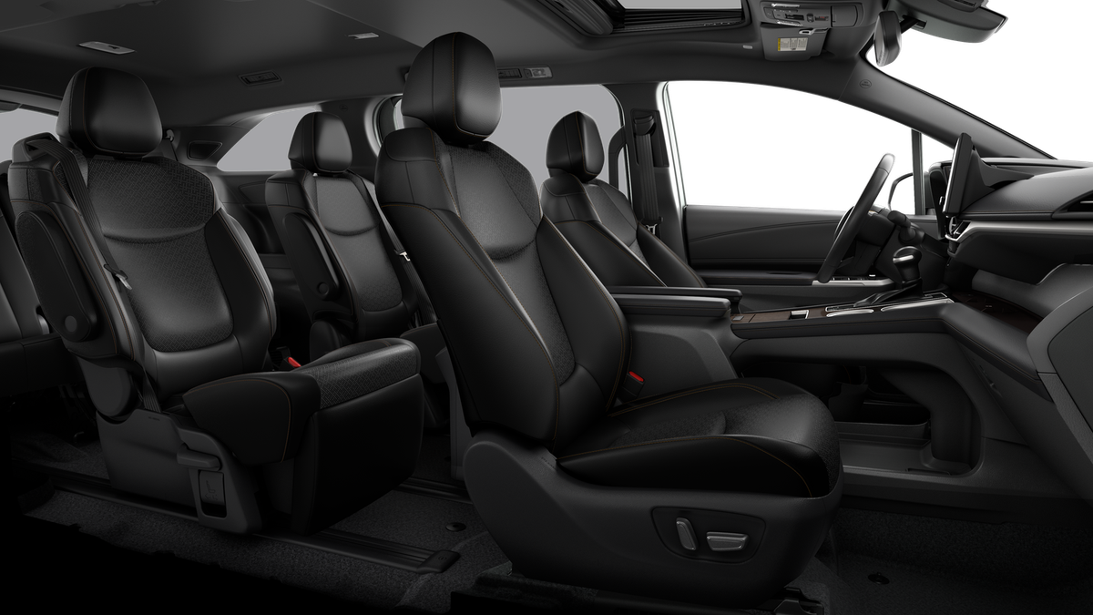 - 7-passenger seating with heated premium leather-trimmed second-row-seat captain's chairs with super-long-slide feature and ottomans ]